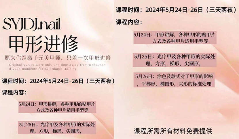 - 1.甲形讲解、各种甲形的贴甲片方式及各种甲片适用手型等,光疗甲及各种甲形的实际处理,方形,梯形,尖圆形,...